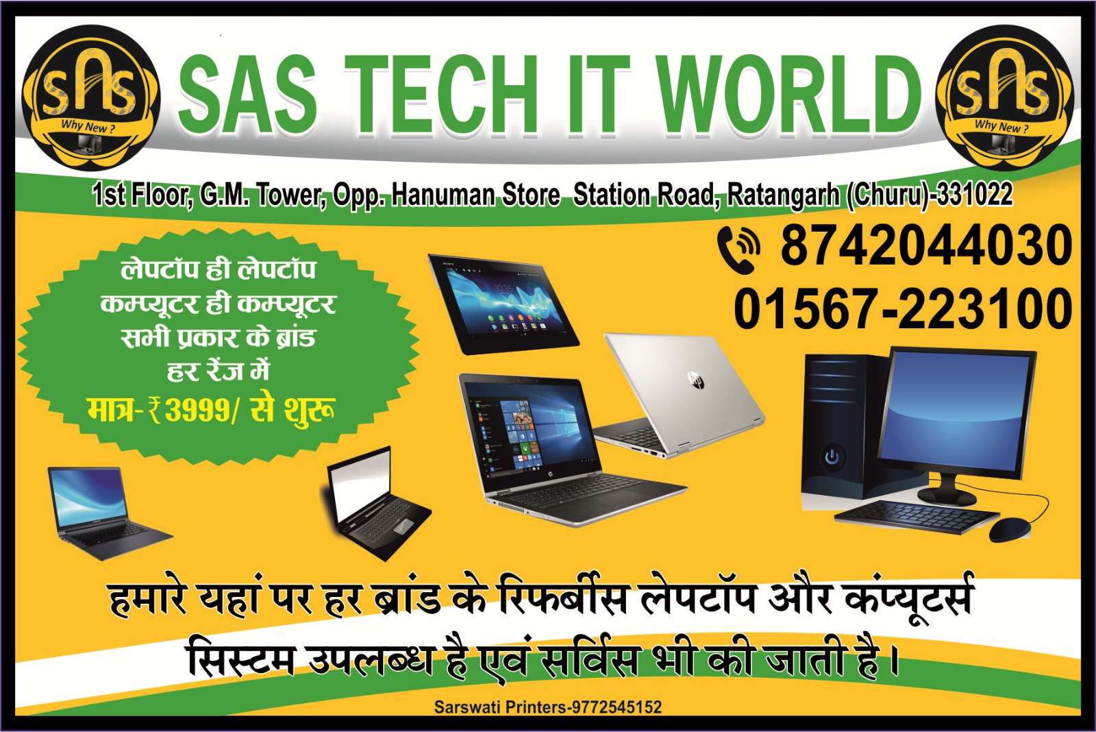 Sas Tech It World Deals in Computers and Laptops Accessories. SAS TECH @Ratangarhis a top player in the category of Computer related Hardware & related accessories. This well known establishment acts as a one stop destination, servicing customers both local & other parts of Rajasthan. Over the course of its journey, this business has established a firm foothold in its industry, on the belief that customer satisfaction is as important as their products & services. It has a wide range of products and/or services to cater to the varied requirements of their customers. Few of our major brands are Dell, HP, Lenovo, Kensington, Kingstone, SanDisk, Intel, Seagate, Logitech, Creative, Transcend, iBall, Sony, LG, D- Link, Crucial, AData, Microsoft, WD, Samsung and many more.